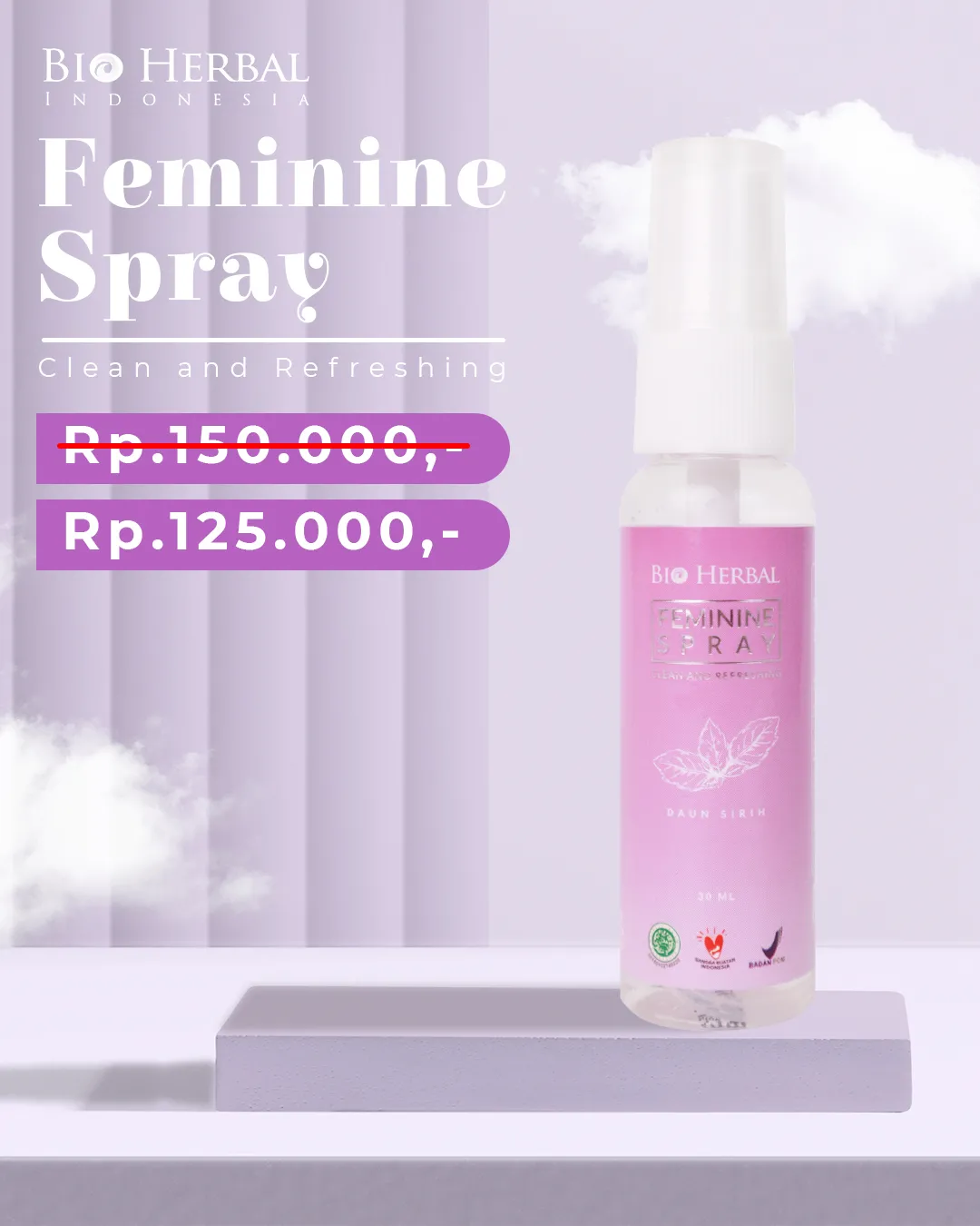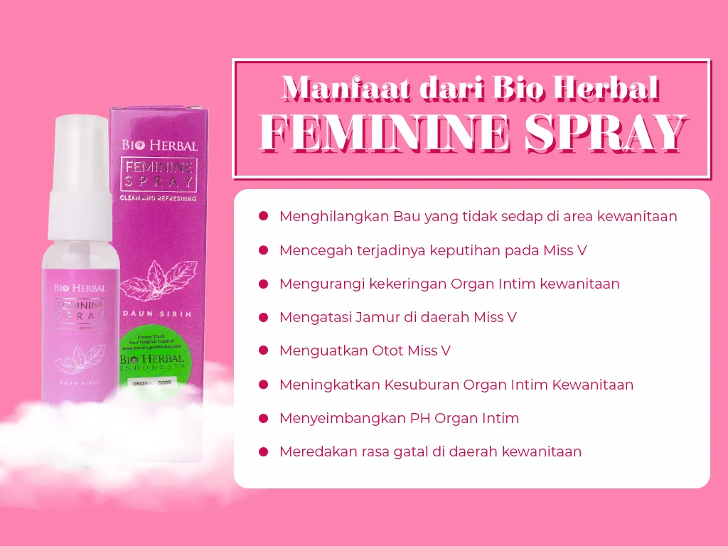 Feminine Spray adalah Produk terbaru dari Bio Herbal yang cocok untuk merawat kewanitaan yang sudah teruji aman sudah lulus sertifikasi BPOM dan memiliki Halal dari MUI RI. Feminine Spray mengandung Daun Sirih Asli 100%, aloe vera, pohon dedalu salix alba, dll yang terbukti ampuh berfungsi dalam menghilangkan bau sedap pada kewanitaan.